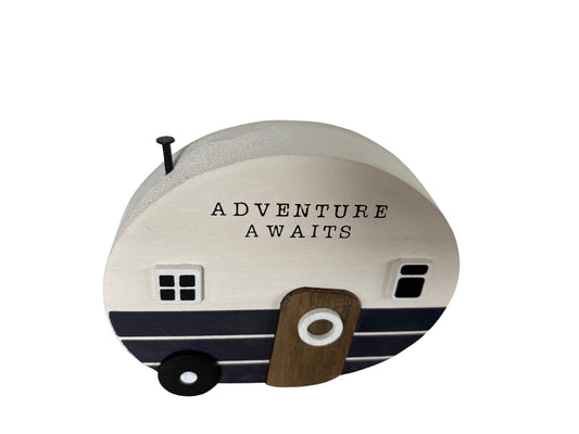 Rustic Wooden Caravan Ornament – “Adventure Awaits” – Portland Living Travel Decor, 12cm
