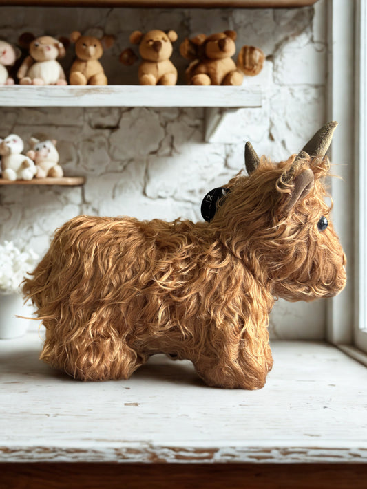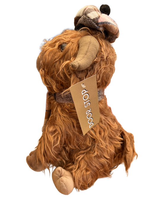 Plush Highland Cow Doorstop – Soft Fluffy Scottish Coo with Curly Hair, 29 cm