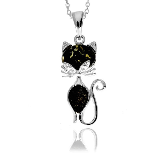 Sterling Silver Cat Pendant with Baltic Amber – Cute Modern Cat Necklace for Her | Animal Lover Gift