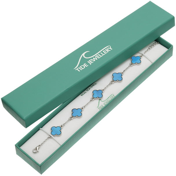 Add a touch of elegance to your jewellery collection with this stunning blue quatrefoil bracelet. Featuring luminous mother of pearl shell inlays set in a rhodium-plated quatrefoil design, this piece combines timeless charm with modern versatility.