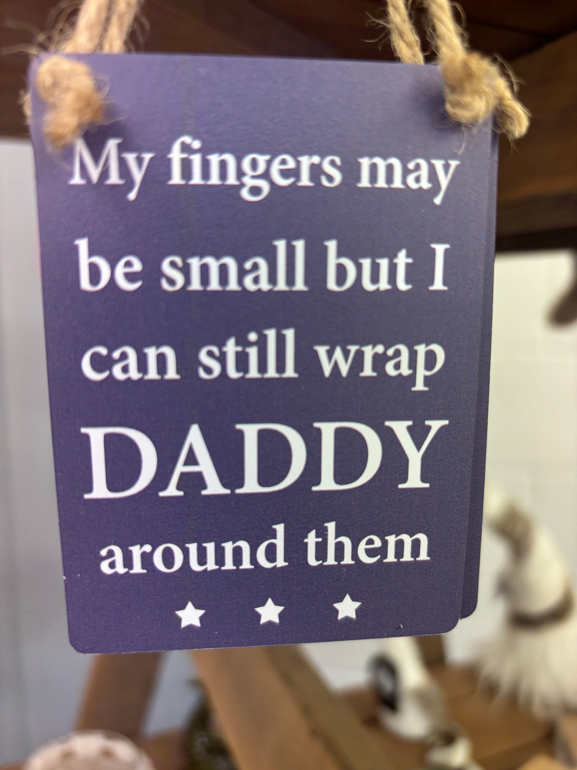 Sweet hanging plaque with “My fingers may be small but I can still wrap Daddy around them” quote. A perfect sentimental gift for Father’s Day or birthdays.