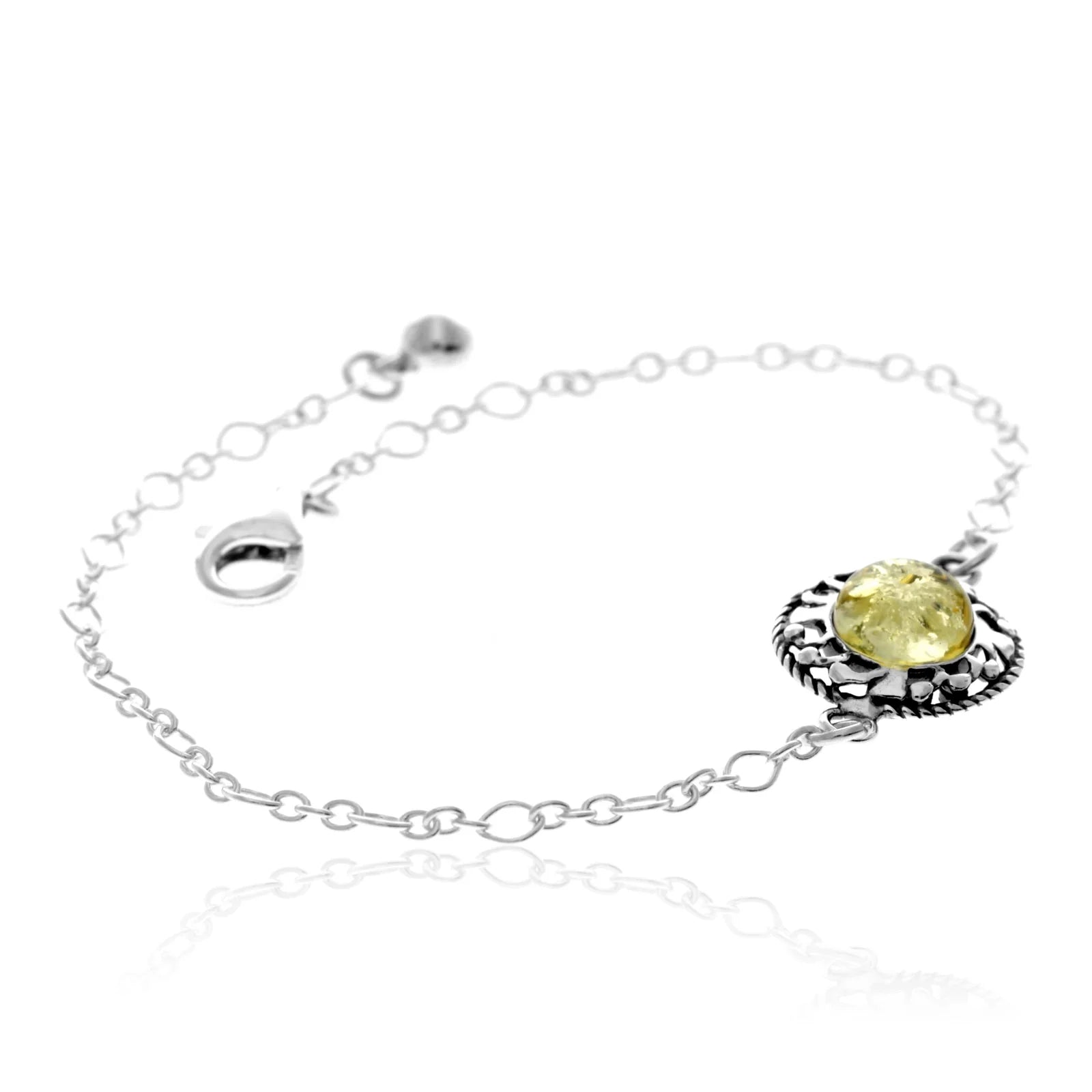 Add a touch of natural elegance to your wrist with this beautiful Sterling Silver Baltic Amber Bracelet. Featuring a polished round amber gemstone set in an intricately detailed 925 sterling silver frame, this bracelet is available in classic cognac, deep green or soft yellow amber.