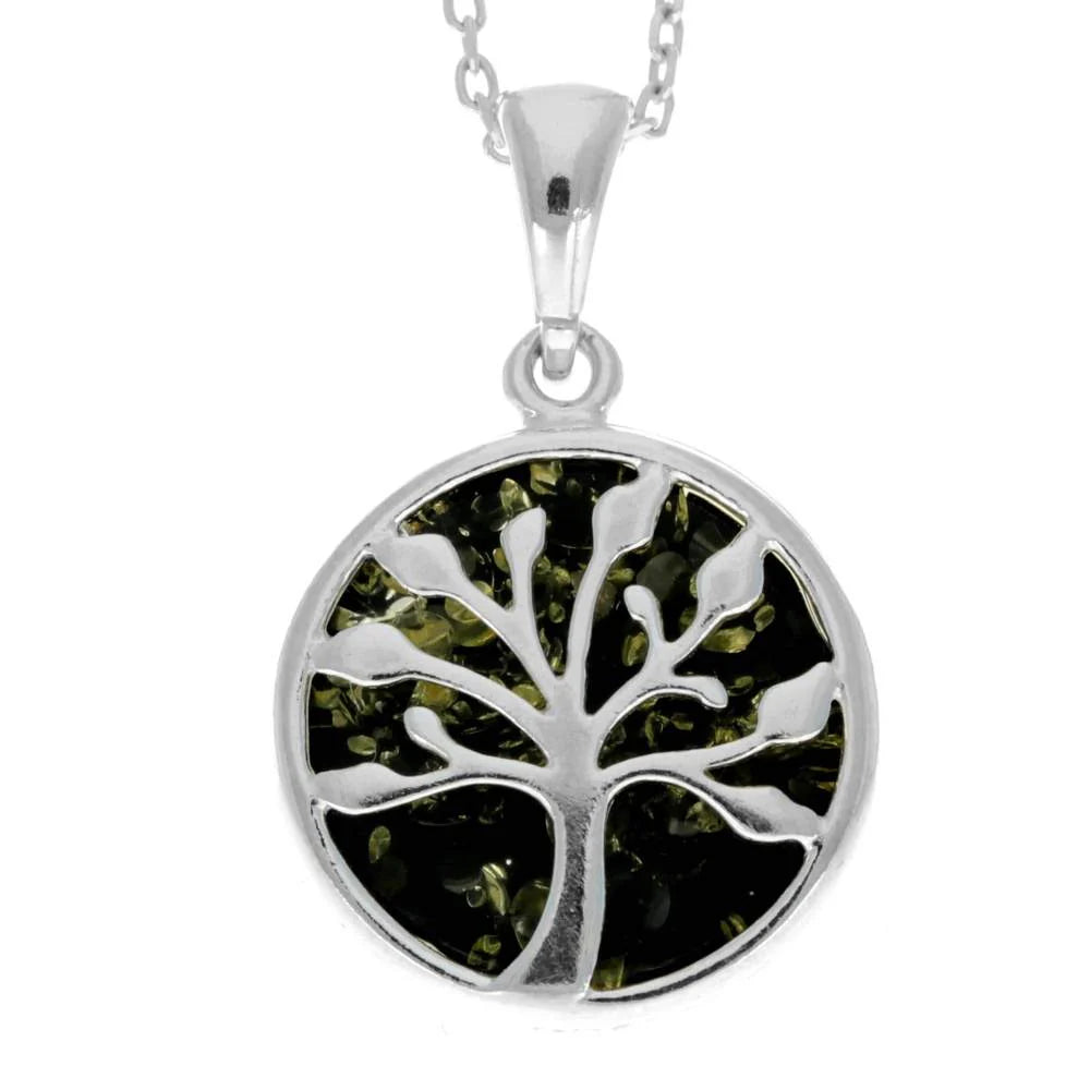 Sterling Silver Baltic Amber Tree of Life Pendant – Genuine 925 Silver Necklace (Cognac or Green)